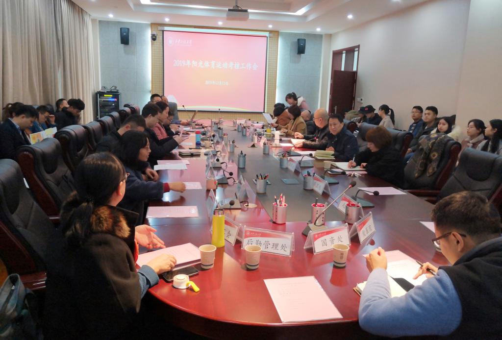 2019年12月13日下午2时,永利官网在临潼校区图书馆一楼会议室召开了2019年阳光体育运动工作考核会议。副校长戴鸿、校体育运动委员会成员单位负责人、各学院党委(总支)副书记、相关教师代表、获奖师生代表共计60余人参加了会议,会议由校体育运动委员会副主任、体育部主任薛海红主持。会上,13个学院从阳光体育运动工作组织与领导、学生早操锻炼组织、学生课外体育活动组织、《国家学生体质健康标准》的测试情况、体育比赛情况等方...