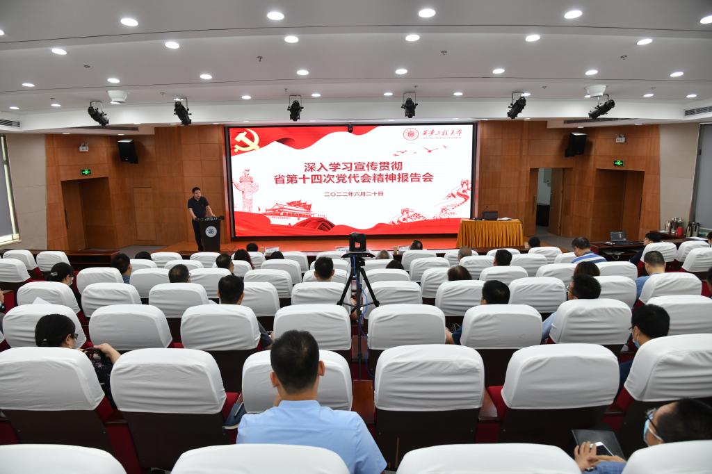 2022年6月20日下午,永利官网召开深入学习宣传贯彻省第十四次党代会精神报告会。省十四次党代会代表、永利官网教务处处长夏蔡娟作宣讲报告。报告会由校党委副书记井浩主持。报告会上,夏蔡娟以《学习贯彻省第十四次党代会精神全面推进学校本科教育教学高质量发展》为题,围绕省第十四次党代会的主题和主要成果、我省过去五年的工作成效、今后五年的奋斗目标、总体要求、主要任务等方面作了全面阐述和深入解读,同时结合新一轮本科教育教...