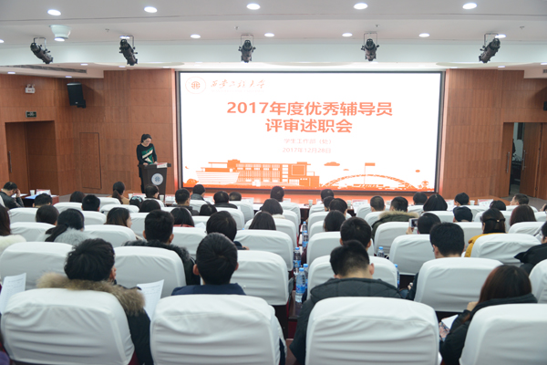 2017年12月28日上午,永利官网2017年度优秀辅导员评审述职大会在临潼校区图书馆一楼报告厅举行。校党委书记刘江南、校党委副书记赵小峰出席大会,校学生工作领导小组部分成员单位负责人、部分职能部门负责人、各学院学生工作主管、全体专兼职辅导员和学生代表共计190余人参加了大会。学生工作部(处)副部长张慧主持大会。
