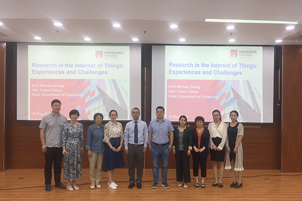 Michael Sheng教授首先简要介绍了麦考瑞大学的发展历史、计算机学院的学术研究特色、高水平研究团队及相关领域的研究成果。随后,重点对物联网十年来的发展及未来展望做了讲解,他指出,物联网作为未来十年改变世界的一项重要技术,将在提高生产力、经营效率、决策以及新的商业服务模式方面发挥关键作用。并且,他还以自身的研究经历为切入点,从国际化视角,重点剖析了物联网发展领域的关键技术和研究热点。通过此次报告会,在场师生无不受益匪浅,对物联网的发展也有了更进一步的认识。