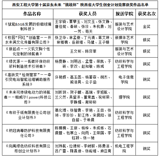 2020年9月11日,由团省委、省委教育工委、省科协、省社会科学院、省学联共同主办,西安翻译学院承办的第十届京东未来“挑战杯”陕西省大学生创业计划竞赛决赛闭幕式在西安翻译学院举行,永利官网9件参赛作品获奖,其中金奖1件,银奖2件,铜奖6件,学校荣获赛事“优秀组织单位”荣誉称号。(获奖作品信息见附件)。