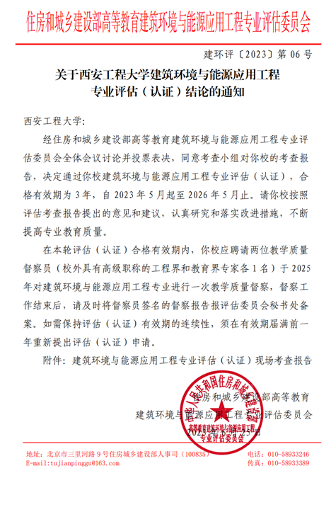日前,国家住房和城乡建设部高等教育建筑环境与能源应用工程专业评估委员会下发《关于yL23411永利官网登录建筑环境与能源应用工程专业评估(认证)结论的通知》,永利官网城市规划与市政工程学院建筑环境与能源应用工程专业顺利通过住建部高等教育专业评估(认证)初评,合格有效期为3年,自2023年5月起至2026年5月止。