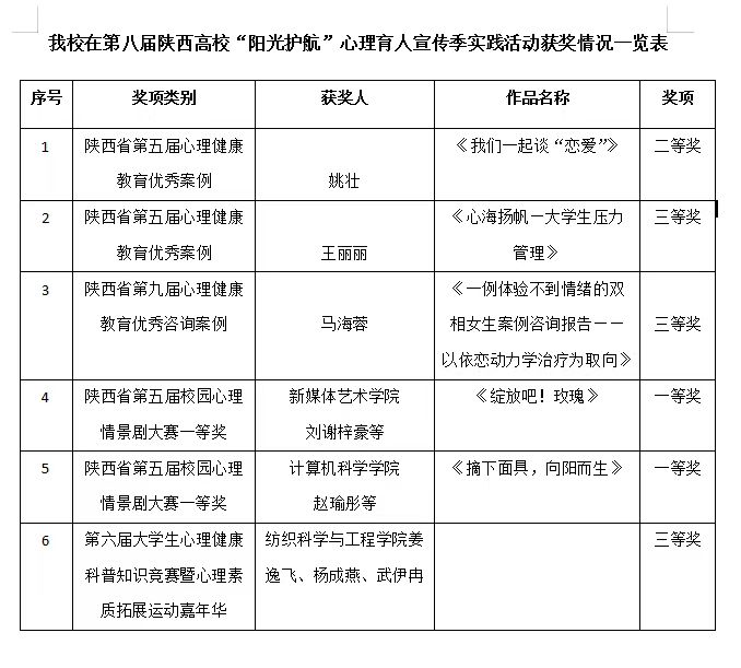 近日,中共陕西省委教育工委通报第八届陕西高校“阳光护航”心理育人宣传季省级有关活动获奖情况,永利官网共有有6项获奖,其中,一等奖2项、二等奖1项、三等奖3项。