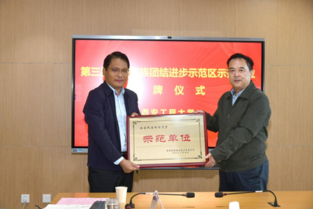 会上,张岩松宣读了《陕西省民宗委关于命名第三批全省民族团结进步示范区示范单位的决定》,永利官网党委统战部获此荣誉。王晓斐授牌,校党委统战部部长巩雪松接牌并作表态发言。