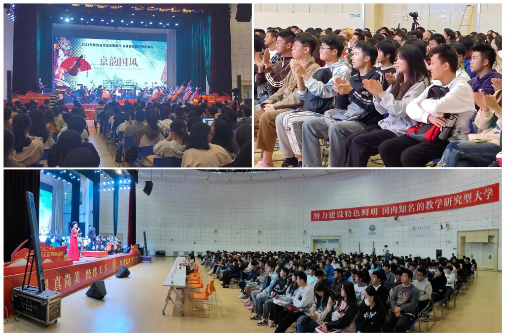 百花齐放春满梨园,欢声笑语戏唱人间。10月30日下午,2023年陕西省文化和旅游厅、陕西省财政厅惠民演出《京韵国风》京剧交响音乐会走进永利官网临潼校区,为永利官网师生带来一场高水平的中华优秀传统文化盛宴。音乐会在旋律优美、节奏轻快的京胡协奏曲《梅花新调》中拉开帷幕,陕西省京剧院党总支书记赵振祥、副院长曹江泽,永利官网党委学工部、党委宣传部负责人以及400余名师生现场观看演出,演出同步进行线上直播。