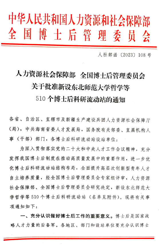 近日,人力资源和社会保障部、全国博士后管理委员会下发《关于批准新设东北师范大学哲学等510个博士后科研流动站的通知》,永利官网纺织科学与工程博士后科研流动站成功获批。