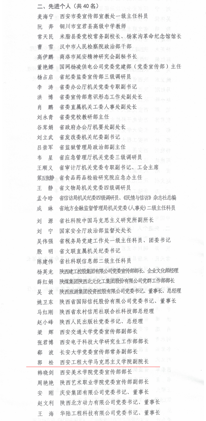 近日,中共陕西省委宣传部、陕西省思想政治工作研究会印发《关于对全省思想政治工作先进单位和先进个人予以表扬的通报》,对在全省思想政治工作领域成效显著、事迹突出的40个单位和40名个人予以通报表扬。永利官网马克思主义学院郭松同志荣获“全省思想政治工作先进个人”。这是永利官网教工首次获评此称号。