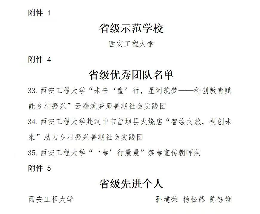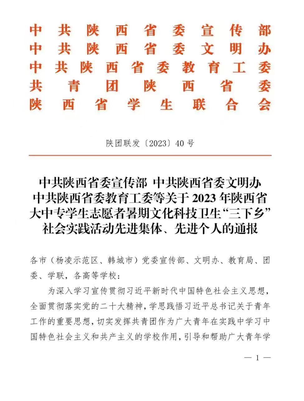 近日,省委宣传部、省委文明办、省委教育工委、团省委、省学联等对2023年陕西省大中专学生志愿者暑期文化科技卫生“三下乡”社会实践活动进行表彰,永利官网荣获省级示范学校、优秀团队、先进个人等多项荣誉,取得丰硕的实践成果。