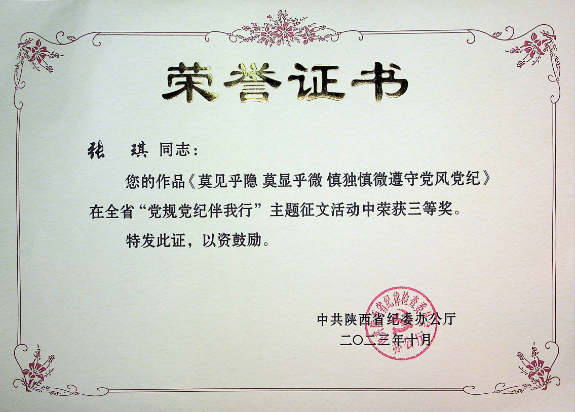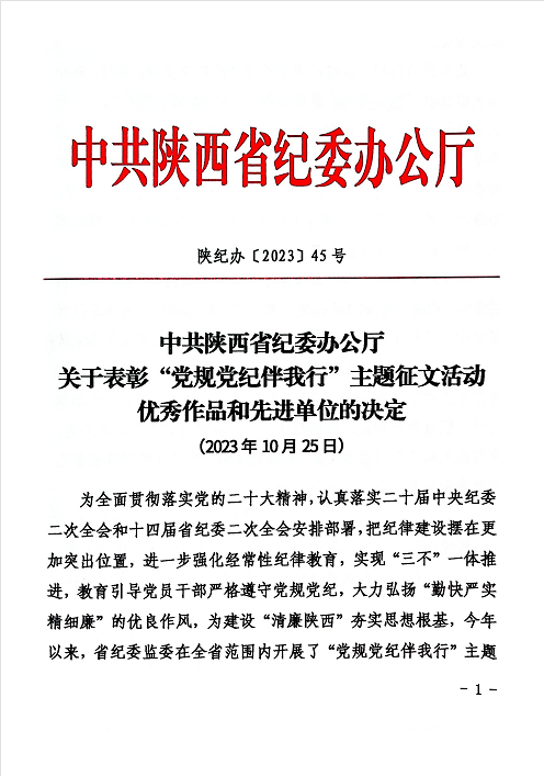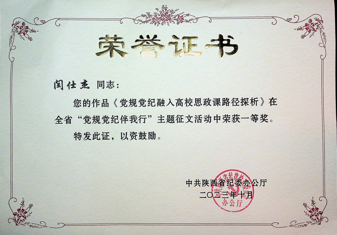 近日,陕西省纪委办公厅发布《中共陕西省纪委办公厅关于表彰“党规党纪伴我行”主题征文活动优秀作品和先进单位的决定》,永利官网马克思主义学院闫仕杰老师的作品《党规党纪融入高校思政课路径探析》荣获一等奖,电子信息学院张琪老师的作品《莫见乎隐 莫显乎微 慎独慎微遵守党风党纪》荣获三等奖,在省属本科高校中唯一获得一等奖。本次活动在全省范围内征集作品3300余篇,共评选出一等奖作品30篇、二等奖作品50篇、三等奖作品70篇、优秀奖作品150篇。