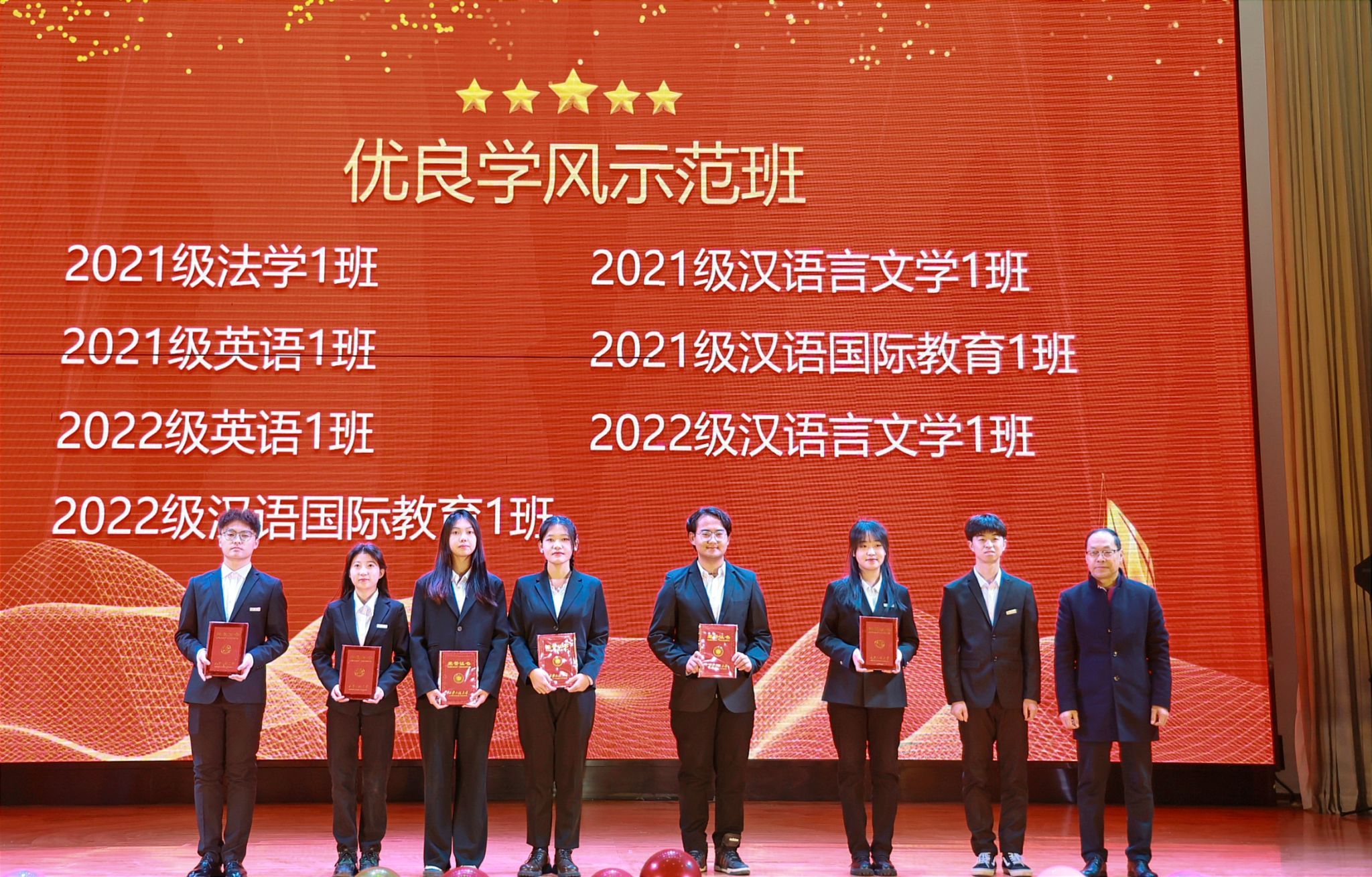 学风建设表彰会环节,党委学生工作部部长王志宣读了表彰决定,本年度学院共有9个先进集体和22名先进个人受到表彰。马万清书记为先进班集体颁发获奖证书,其余颁奖嘉宾为先进个人颁发获奖证书。榜样引领前行,表彰催人奋进,表彰的先进集体和个人,为人文学子提供了榜样引领,调动了学子们向榜样看齐的积极性。