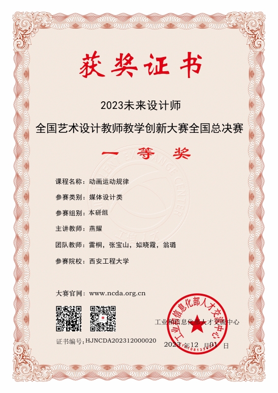 日前,2023年未来设计师·全国艺术设计教师教学创新大赛(教创赛)课程赛道全国总决赛在上海工程技术大学圆满落幕。永利官网新媒体艺术学院燕耀等教师组成的团队主讲《动画运动规律》课程通过现场答辩,获得2023年未来设计师·全国艺术设计教师教学创新大赛(教创赛)课程赛道全国总决赛一等奖。