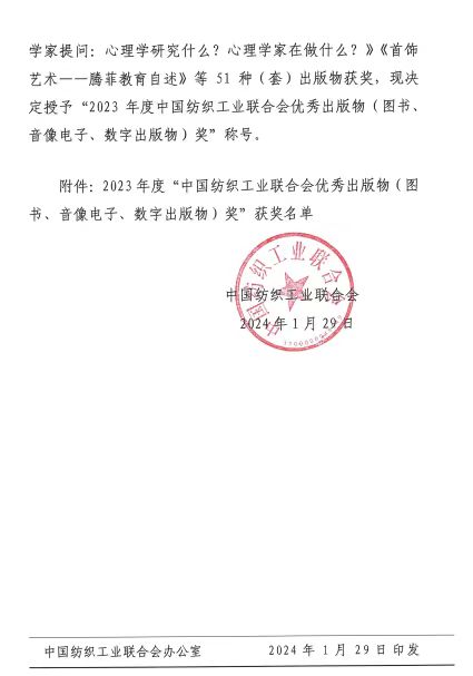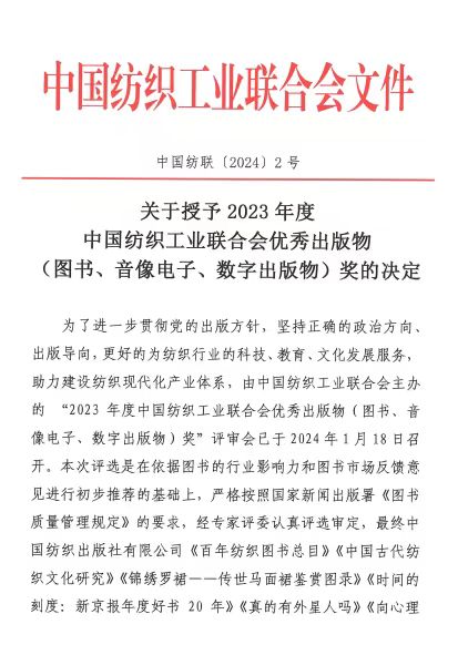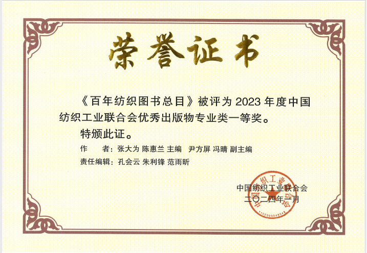 近日,中国纺织工业联合会《关于授予2023年度中国纺织工业联合会优秀出版物(图书、音像电子、数字出版物)奖的决定》,永利官网图书馆张大为、尹方屏老师联合东华大学共同编纂的成果《百年纺织图书总目》荣获2023年度中国纺织工业联合会优秀出版物一等奖。