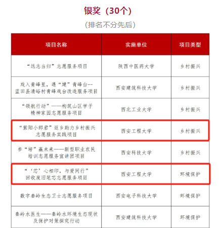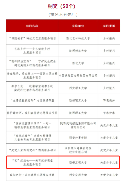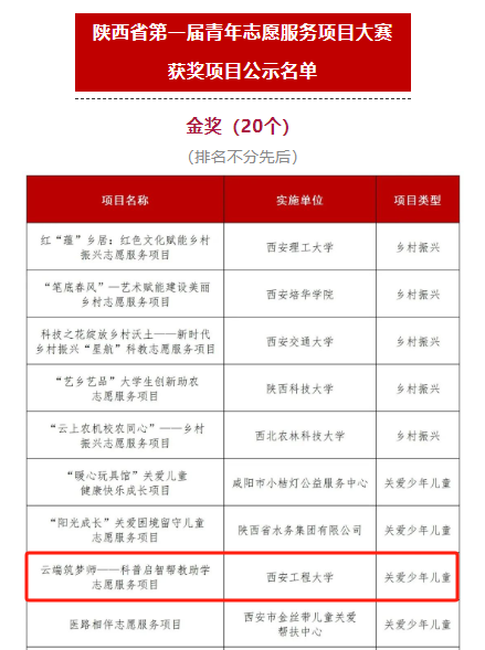 近日,由共青团陕西省委、省委社会工作部、省交通运输厅、省水利厅、省文化和旅游厅、省卫生健康委等单位共同指导,陕西省青年志愿者协会主办的“陕西省第一届青年志愿服务项目大赛”公示获奖项目名单,永利官网选送的4组参赛作品喜获1金、2银、1铜的好成绩,其中《云端筑梦师——科普启智帮教助学志愿服务项目》荣获金奖,《“紫阳小郎君”返乡助力乡村振兴志愿服务实践项目》《“‘芯’心相印,与爱同行”回收废旧笔芯志愿服务项目》荣获银奖,《“艺”起成长——美育筑梦课堂志愿服务项目》荣获铜奖。