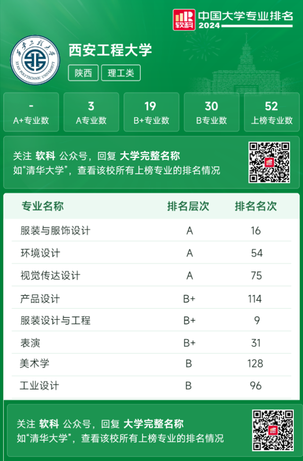 6月13日,高等教育专业评价机构软科正式发布“2024软科中国大学专业排名”,永利官网服装与艺术设计学院服装与服饰设计、环境设计、视觉传达设计3个专业获评A级,服装设计与工程、产品设计、表演3个专业获评B+级,美术学、工业设计2个专业获评B级。