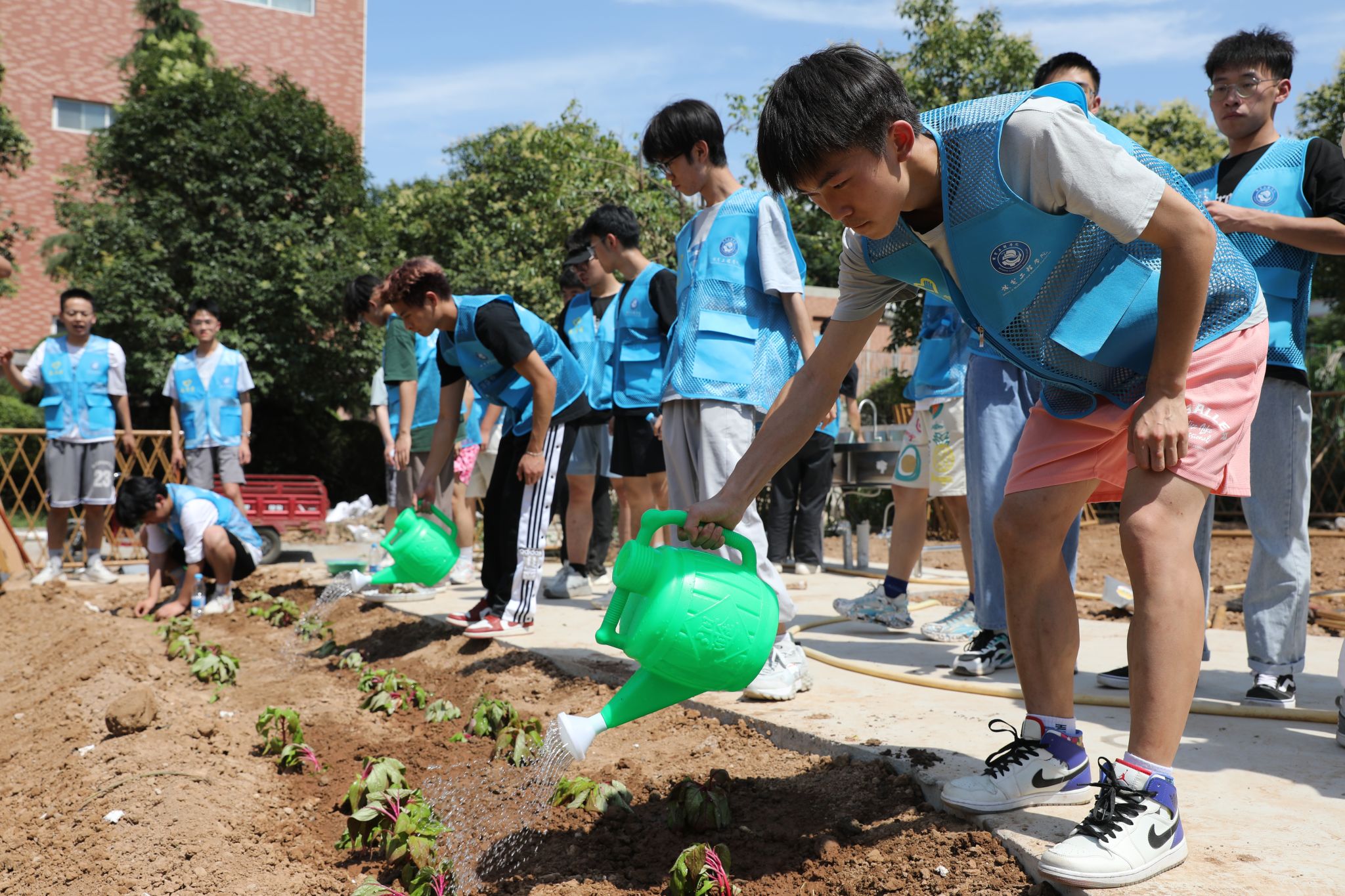 学生们争先恐后地拿起农具走进田里,从松土保墒到种植浇灌,一块块蔬菜田整齐划一,虽然午后的阳光十分炽烈,但阻挡不了学生们的热情。