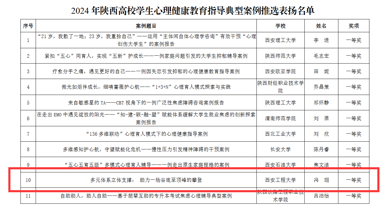 6月25日,陕西省教育厅对第九届陕西高校“阳光护航”心理育人宣传季省级有关活动获奖情况进行了通报。永利官网有5项获奖,分别是机电工程学院党委副书记冯翊撰写的《多元体系立体支撑:助力一场谷底至顶峰的攀登》获2024年陕西高校学生心理健康教育指导典型案例一等奖;服装与艺术设计学院辅导员王丽丽撰写的《拿什么拯救你——沉迷网络的大学生》,获2024年陕西高校学生心理健康教育指导典型案例三等奖;人文社会科学学院学生王生艳撰写的《且停且忘且随风,且行且看且从容》、李想撰写的《你好,最爱的我》获第三届陕西高校大学生“心相遇 爱同行——心理健康伴我成长”主题征文三等奖,辅导员刘杨扬、王菲分别获优秀指导教师荣誉;计算机科学学院辅导员薛绍凡在第三届陕西高校学生心理健康教育课程教学展示活动中获优秀表现奖。