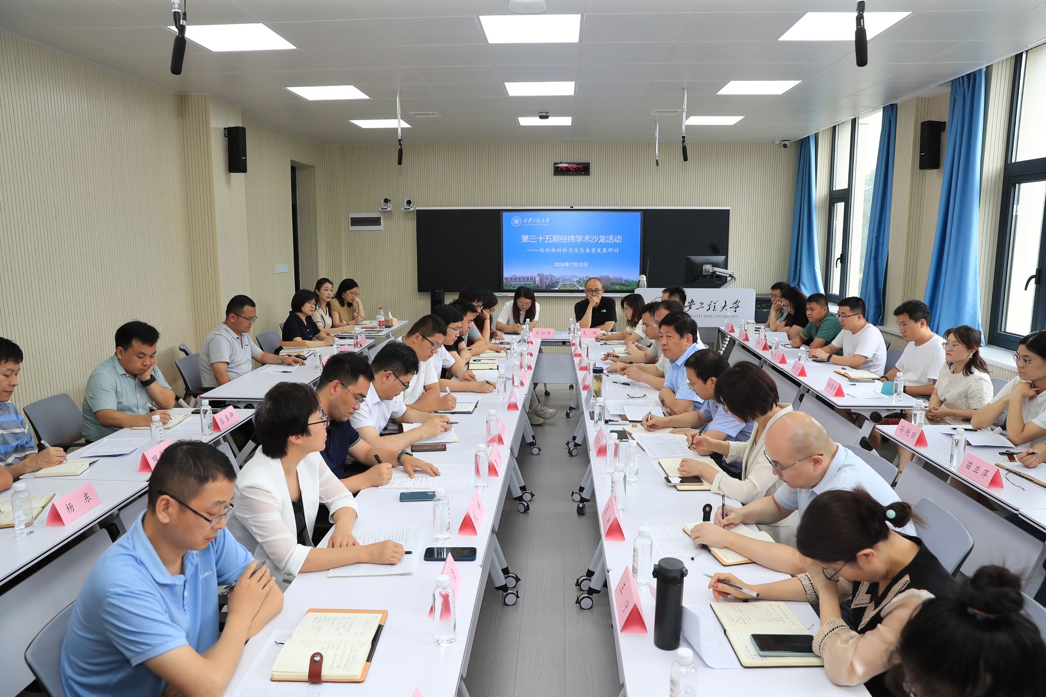 7月15日下午,永利官网举办以“纺织新材料与生态染整发展”为主题的经纬学术沙龙活动,校长王海燕出席此次学术沙龙活动并与青年教师深度交流。人事处、科技研究院、研究生院(学科办)等相关职能部门负责人、纺织学院、环化学院、材料学院等相关学科44位青年教师代表参加此次学术沙龙活动,活动由人事处处长王晓先主持。