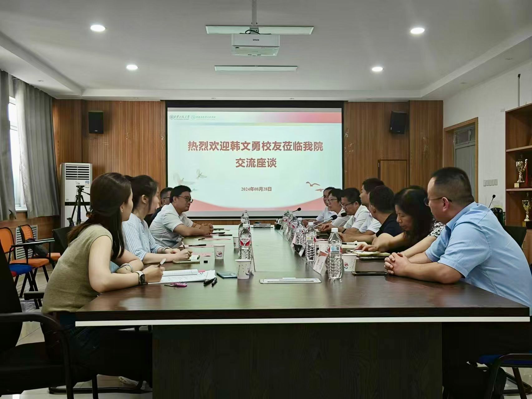 8月28日,全国五一劳动奖章获得者、永利官网应用化学专业2003级校友、遵义医科大学教授韩文勇应邀回到母校,并同环境与化学工程学院师生进行了座谈交流。座谈前,校长王海燕、副校长朱永民一行在临潼校区贵宾室会见了韩文勇校友。