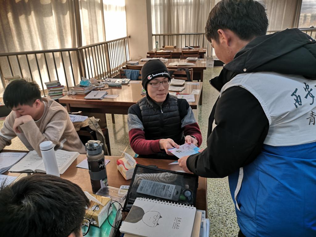 12月5日当天,为了给永利官网考研学子加油鼓劲,校青年志愿者总队制作书写了350余张祝福卡片赠送给正在临潼校区图书馆奋战的考研学子们。在金花校区,志愿者们还通过校园广播送祝福,让每一名考研学子感受到温暖。各学院青年志愿者分队在两校区开展了“美化校园——志愿者在行动”活动,60余名志愿者清理了校园内多个宣传栏,为美化校园环境贡献了自己力量。在临潼校区,由计算机学院志愿者们组织开展的“网络安全知识”广场宣传活动同样吸引了许多同学驻足,参与互动。校青年志愿者总队还联合了社会公益团体,举办了“爱心搭窝”活动。