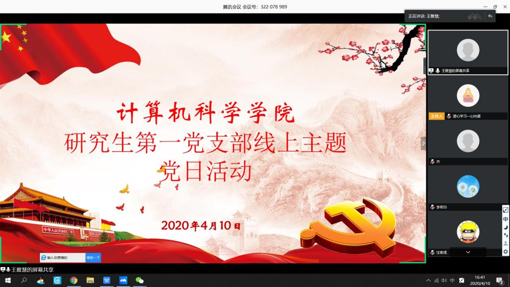 为深入学习贯彻习近平总书记关于疫情防控重要讲话、重要指示批示精神,积极响应陕西省委和校党委号召开展向“三秦楷模”等先进人物和先进集体学习的活动。4月10日下午,计算机科学学院研究生第一党支部利用网络平台开展线上专题组织生活会和主题党日活动,支部全体党员参加,会议由党支部书记王雅慧主持。