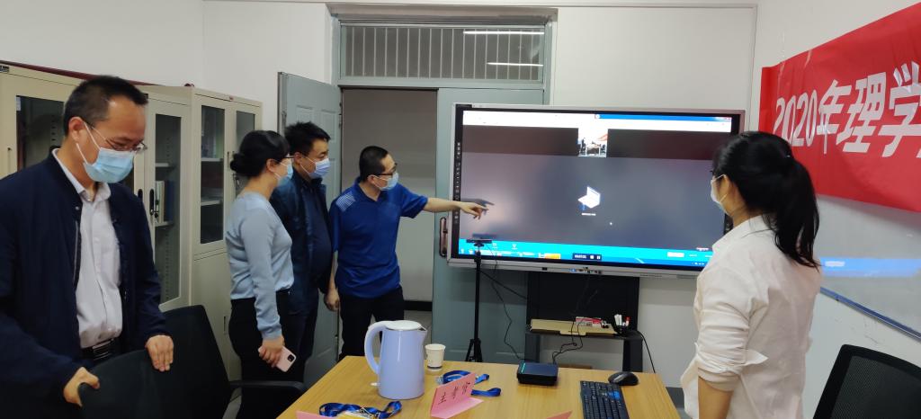当天下午,理学院党委书记陈宣、院长夏蔡娟,党委副书记杨森、副院长马盈仓检查研究生复试相关准备工作。工作人员现场介绍了在线复试设备调试、场地安排、场地通风消杀等情况。