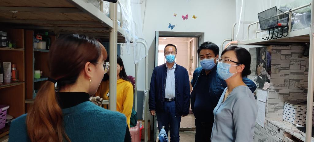 随后,学院领导到返校学生宿舍走访慰问,详细了解同学们在家状况、到校生活情况、毕业论文撰写、就业单位落实等,查看宿舍的卫生状况和通风消杀记录,并细致询问同学们在校学习生活困难,告诉同学们,有困难及时与老师们取得联系,老师们会尽力帮同学们解决。希望同学们返校后安心进行学习生活,做好宿舍内务整理和消杀,保持良好的生活习惯,加强个人防护,按照校院两级相关要求按时进行晨午检,在指定区域用餐。同学们对老师们的到来倍感高兴,对学校发放的爱心包和学院配发的消毒喷壶、84消毒液、清洁袋表示感谢。
