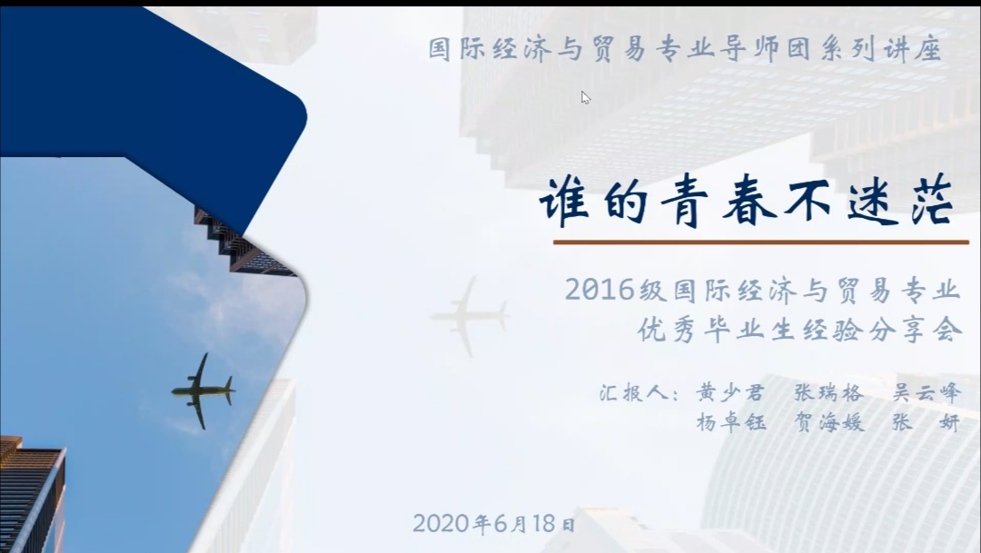 2020年6月18日晚,管理学院国际经济与贸易专业导师团“谁的青春不迷茫”——优秀毕业生经验交流会在线上举办。此次的汇报人是六位优秀毕业生黄少君,张瑞格,吴云峰,杨卓钰,贺海媛,张妍。他们就应届毕业生考研和就业这两个方面分享了自己的经验和见解,解答了同学们就这两个方面提出的问题,帮助同学们明确方向,同时增强了同学们的信心和动力。同时参与此次交流会的有国际经济与贸易专业三全育人导师团和2017-2019级国际经济与贸易专业的本科生。讲座由16级国际经济与贸易二班班长杨智源担任主持人,他先阐述了本次交流会的目的和意义,并为同学们详细介绍了六位优秀毕业生,欢迎了来参会的各位老师。