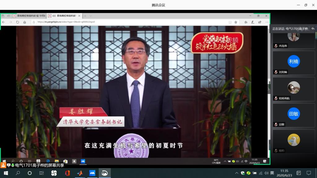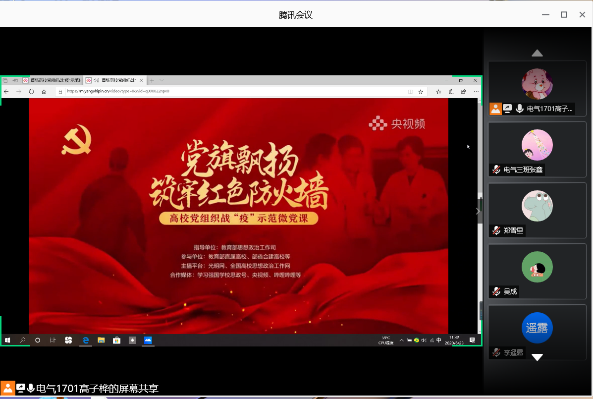 为贯彻落实党中央关于常态化疫情防控的决策部署,充分发挥基层党组织战斗堡垒作用和学生党员先锋模范作用,2020年6月23日,电子信息学院学生第四党支部通过腾讯会议,组织32名党员集体上“高校党组织战疫示范微党课”第一讲(以下简称“微党课”)。本次线上上党课由支部书记刘风萍主持。