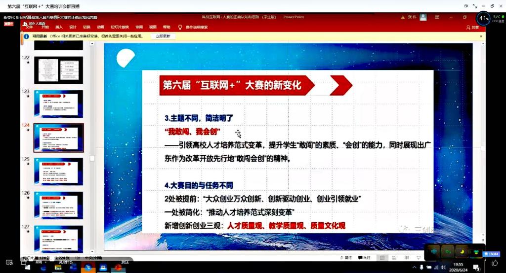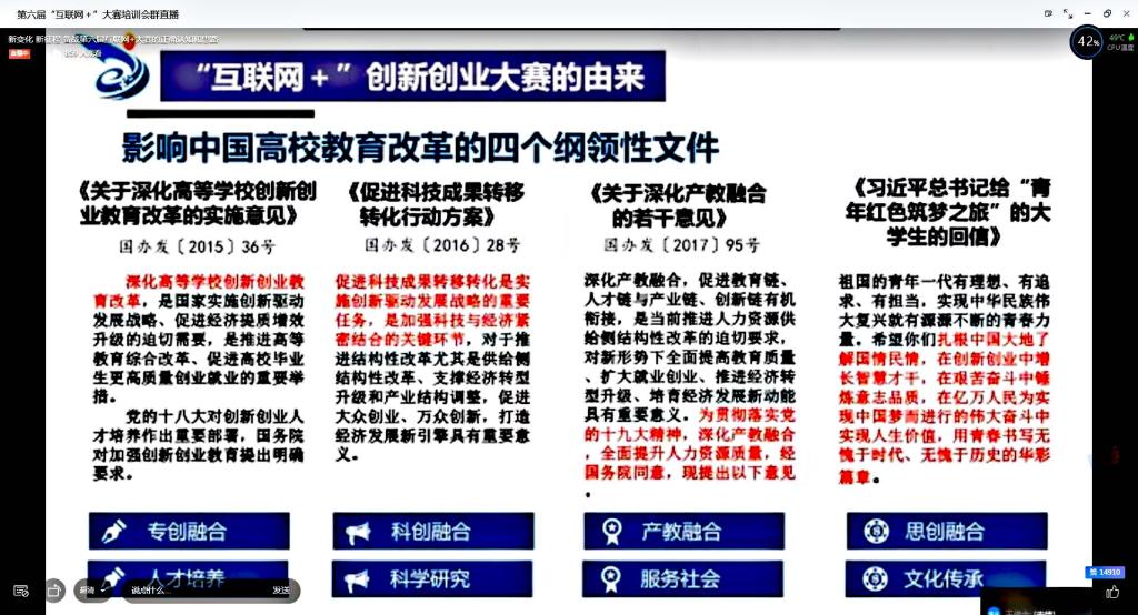 为进一步做好永利官网第六届中国国际“互联网+”大学生创新创业大赛的备赛工作,切实提升永利官网参赛项目的质量和水平,提升指导教师和学生团队创新创业能力,使参训人员了解更多创新创业竞赛常识,进一步增强创新创业教育的科学性和实效性。2020年6月24日,永利官网举办第六届中国国际“互联网+”大学生创新创业大赛线上培训,会议邀请教育部首批创新创业指导师张伟进行线上培训指导。本次会议由教务处主办,纺织科学与工程学院三全育人导师团承办。会议由纺织科学与工程学院党委副书记郭西平主持,各学院1000余名学生参加培训会。