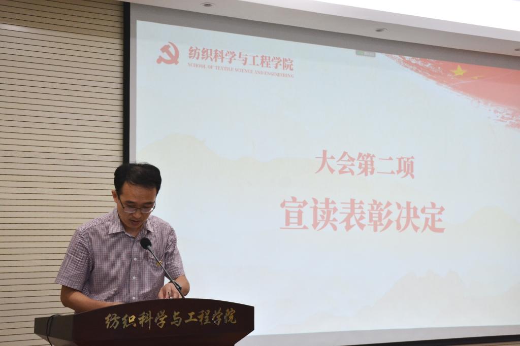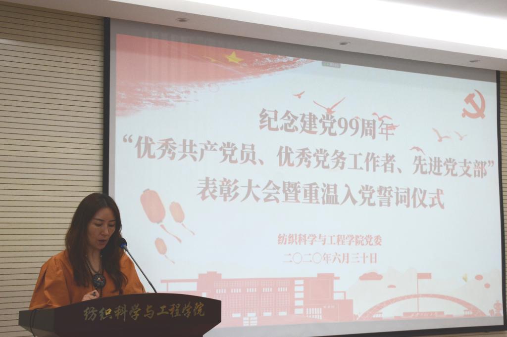 6月30日下午,纺织科学与工程学院党委在金花校区姚穆报告厅采取线上线下结合的方式举办了庆祝建党99周年“优秀共产党员、优秀党务工作者、先进党支部”表彰大会暨重温入党誓词仪式。学院党委领导班子成员、党支部书记以及受表彰的优秀共产党员、优秀党务工作者、先进党支部代表和新发展党员代表参加活动。大会由学院党委副书记郭西平主持。