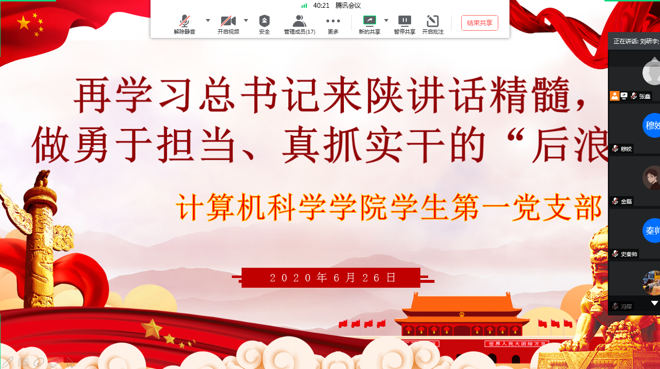 6月26日,支部组织全体党员对习近平总书记来陕考察期间的重要讲话重要指示精神进行再学习、再讨论。在对前期学习成果广泛交流的基础上,支部书记张鑫要求大家要一如既往地贯彻学习习近平总书记来陕考察重要讲话精神,领悟其实质、汲取其内涵、淬炼自我灵魂。希望大家能通过扎实有效的再次研学来磨练自身党性,提升自身修养,用实际行动,践行入党初心,做勇于担当、真抓实干的“后浪”。