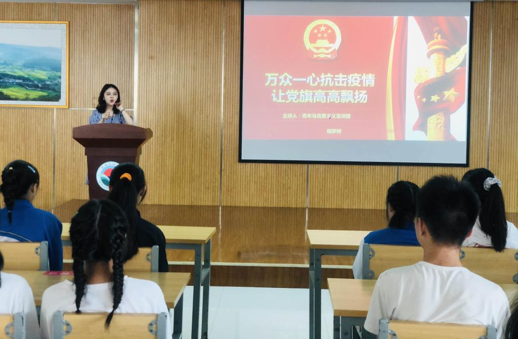 2020年7月2日下午,yL23411永利官网登录马克思主义学院青年马克思主义理论宣讲团成员赴安康市岚皋县花里中学开展的“共抗疫情,爱国力行”主题宣讲活动,花里中学副校长张永贵、教务处主任张威明、党支部副书记汪辉、团支部书记李双双及全体初中生参加了此次活动。