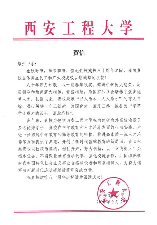 2020年9月,铜川耀州中学迎来八十华诞。9月6日,该校隆重举行八十年庆祝活动。直属单位党总支书记高建会、人文社会科学学院工会主席魏庆受邀参加了该校举行的系列庆祝活动。