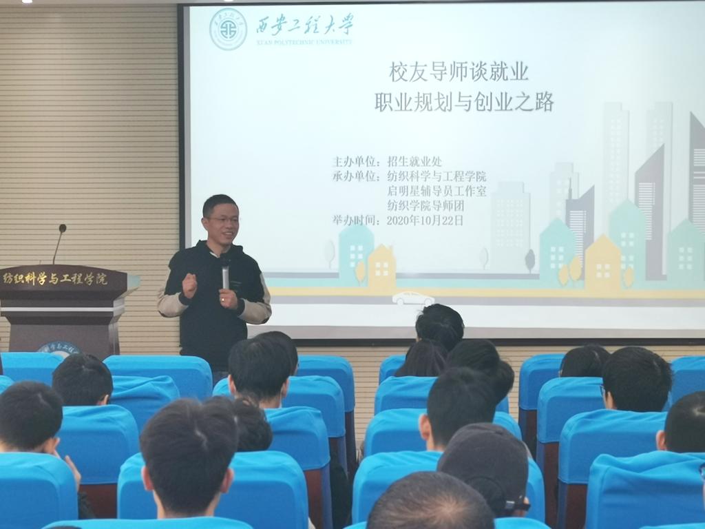 为帮助学生做好入职前职业规划,快速完成学校到职场的角色的转变,提升就业核心竞争力,2020年10月22日,纺织科学与工程学院在金花校区姚穆报告厅举办校友导师谈就业第一期,邀请永利官网1999届校友南通迪泰纺织品有限公司总经理高峰为毕业生作题为“职业规划与创业之路”的报告。本次活动由永利官网招生就业工作处主办,纺织科学与工程学院、启明星辅导员工作室、纺织科学与工程学院导师团承办。纺织科学与工程学院副院长王进美出席报告会,金花校区研究生、本科生共100余人聆听了报告。讲座由启明星生涯工作室主持人高黎主持。