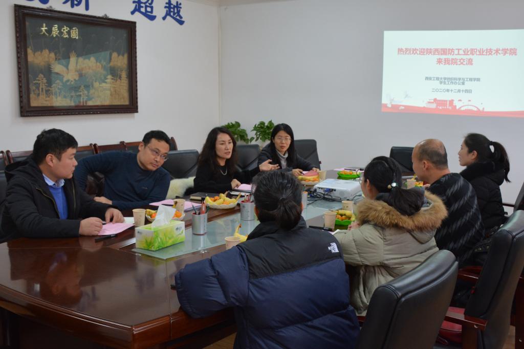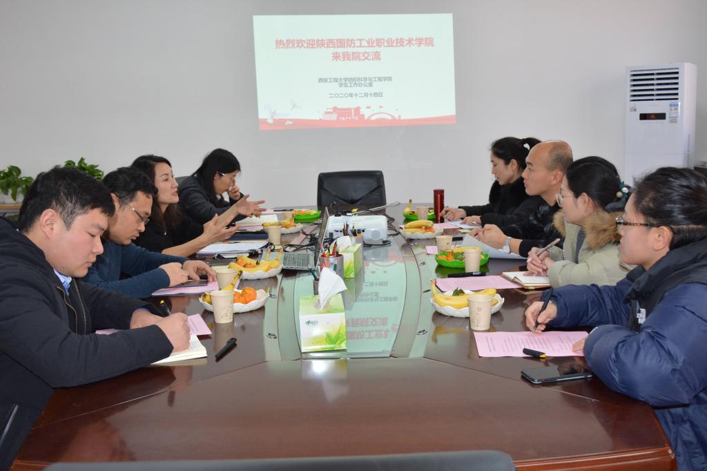 2020年12月14日,陕西国防工业职业技术学院智能制造学院党总支副书记兼副院长沈博、学生科长樊英鸽一行4人来永利官网纺织科学与工程学院交流学习。纺织学院党委副书记郭西平,学生工作办公室主任赵勇进,团总支书记付成程,辅导员高黎、邓恩征、苏娜等参加交流会。