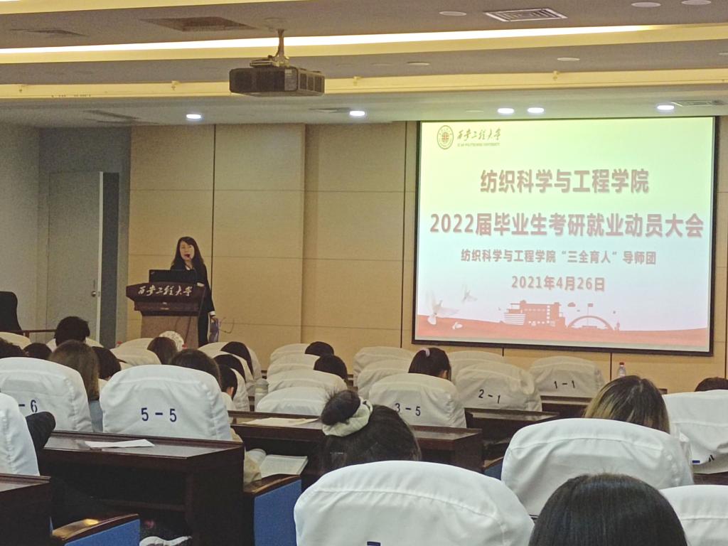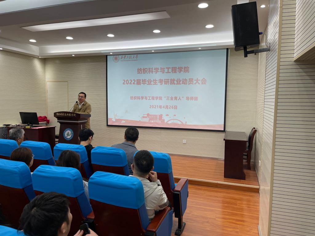 4月26日,纺织科学与工程学院在金花校区如意报告厅和姚穆报告厅同时举办2022届毕业生考研就业动员大会。学院党委副书记郭西平,副院长王进美、刘呈坤,二级教授邢建伟,院长助理樊威,学生工作办公室主任赵勇进,各科研团队代表,2018级辅导员邓恩征及2018级全体本科生参加会议。大会由赵勇进主持。