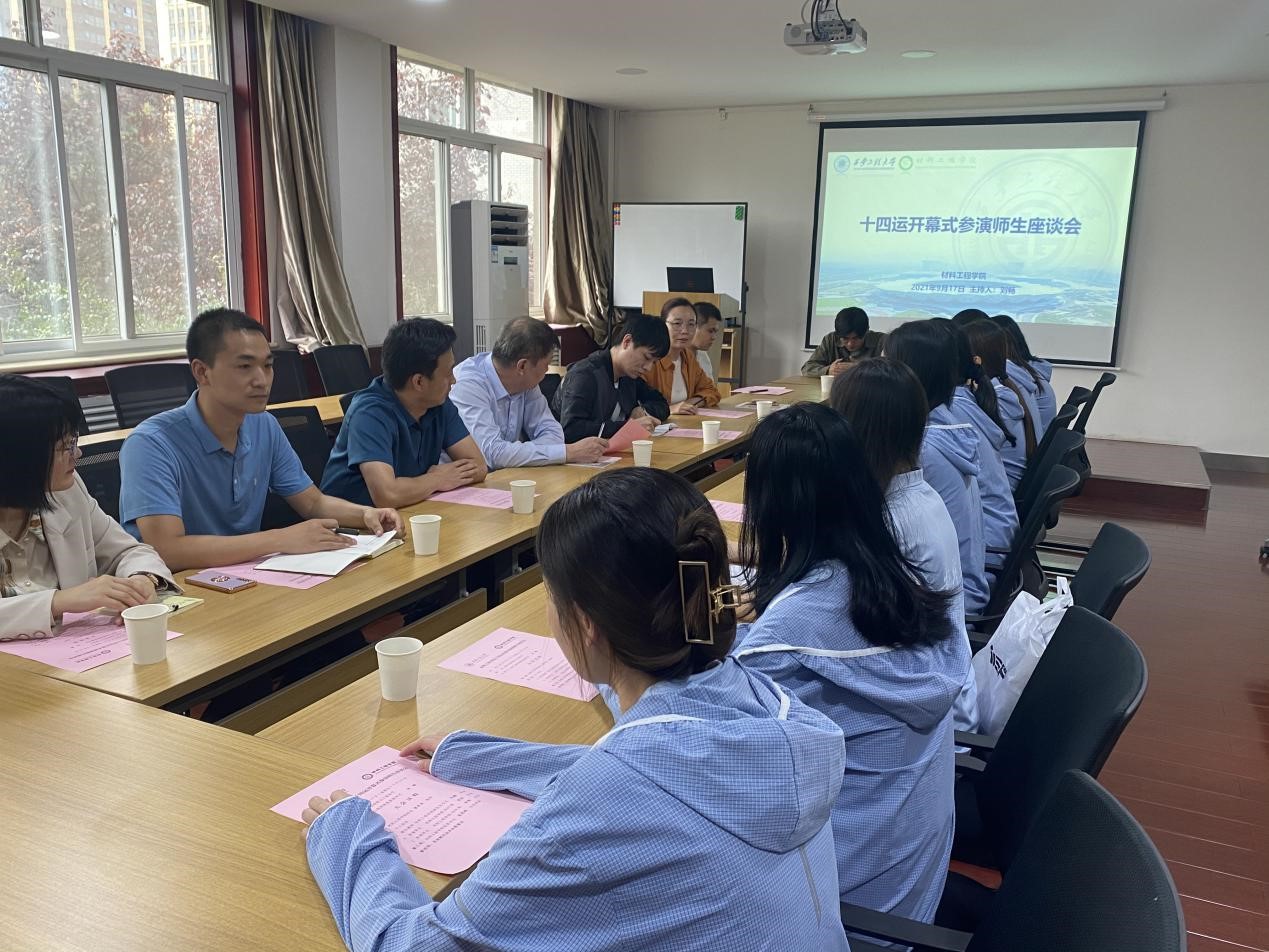 9月17日下午,材料工程学院十四运参演师生座谈会在金花校区学院215会议室召开。学院院长贺辛亥、党委书记张茂林、党委副书记刘畅、十四运带队教师马越、2019级班主任以及十四运参演学生参加了本次座谈会,座谈会由刘畅主持。