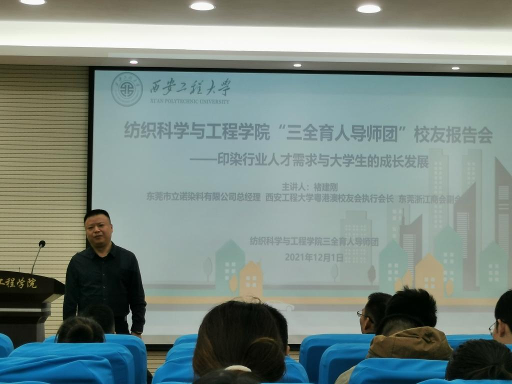 2021年12月1日,纺织科学与工程学院三全育人导师团在金花校区姚穆报告厅举行“印染行业人才需求与大学生的成长发展”校友报告会。东菀市立诺染料有限公司总经理、永利官网粤港澳校友会执行会长、东湾浙江商会副会长、永利官网轻化工程95级校友褚建刚,东菀市立诺染料有限公司副总经理、永利官网轻化工程07级校友孟昆,永利官网轻化工程09级校友王婷,纺织学院党委书记李伟,轻化系主任陆少锋、教授王雪燕、教师赵川,就业辅导员邓恩征,纺织工程专业、轻化工程专业2018、2019级部分本科生和研究生聆听报告会。会议由纺织学院党委副书记郭西平主持。