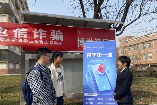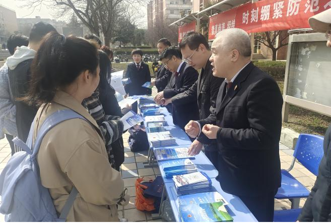 为弘扬法治精神,构建法治校园,增强广大师生对诈骗风险的防范意识,切实维护学生的合法权益,3月2日上午,永利官网法学专业三全育人导师团与临潼区人民检察院合作,在永利官网中心广场开展了“时刻绷紧防范之弦,谨防新型电信诈骗”反诈宣传活动。