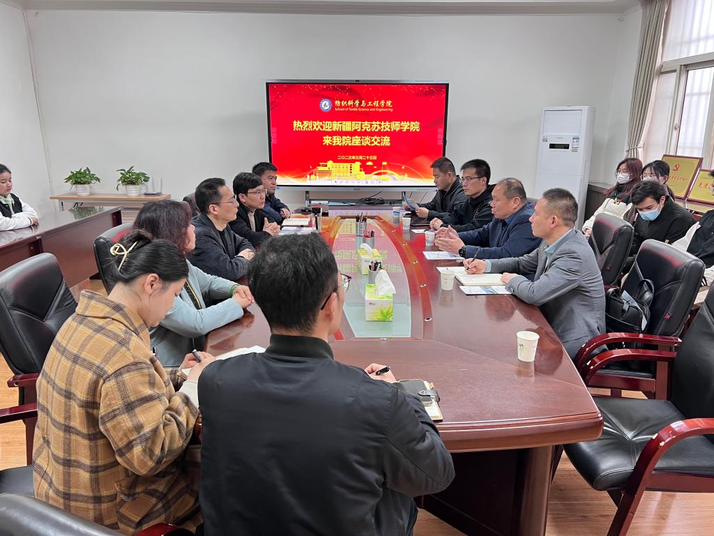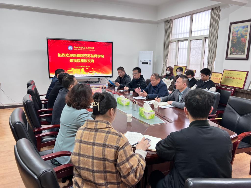 3月23日,新疆阿克苏技师学院党委委员、纪检委书记陆启民,组织人事处处长陈柏松,机电工程系副主任赵鹏飞,纺织服装系主任孙彦平一行来访纺织科学与工程学院。纺织学院党委书记李伟、党委副书记朱宇军、院长助理樊威、轻化工程系主任陆少锋进行接待,辅导员曹鑫、苏娜及2023届本科毕业生、2020级部分学生及新疆籍学生代表也参加了本次座谈交流活动。
