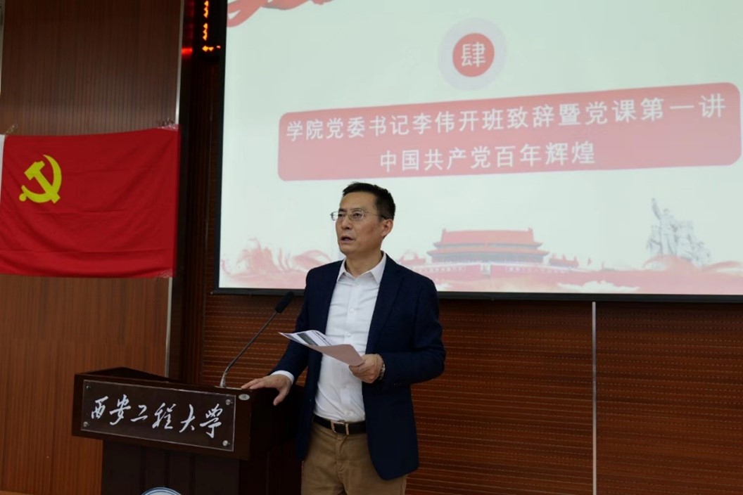 最后,学院党委书记李伟为开班致辞并进行党课第一讲《中国共产党百年辉煌》。李伟老师带领同学们回顾了中国共产党百年奋斗史:由开天辟地:中国共产党在新民主主义革命时期完成救国大业到改天换地到中国共产党在社会主义革命和建设时期完成兴国大业;再到翻天覆地:中国共产党在改革开放和社会主义现代化建设新时期推进富国大业;最后到惊天动地:中国共产党在中国特色社会主义新时代推进并将在本世纪中叶实现强国大业。这是共产党用鲜血、汗水、泪水、勇气、智慧、力量写就的百年;是筚路蓝缕、披荆斩棘、艰苦创业、砥砺前行、充满艰险、充满神奇的百年。李伟老师希望同学们应努力学习,争做表率,发扬担当斗争精神,树立不负家国情怀,追求高尚纯粹思想,为中华民族伟大复兴而拼搏奉献,在新时代新征程上留下无悔的奋斗足迹。最后,李老师寄语同学们能够定目标、见行动和出成绩。