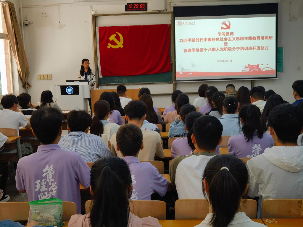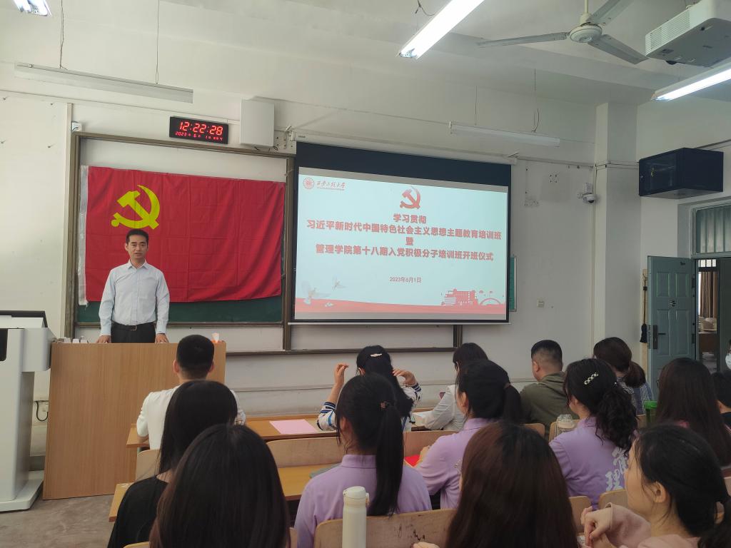 为深入学习贯彻习近平新时代中国特色社会主义思想,进一步加强对入党积极分子的培养、教育和考察,提高入党积极分子的思想政治素质,引导青年学生听党话、跟党走,争做有理想、敢担当、能吃苦、肯奋斗的新时代好青年,牢固树立为共产主义事业和中国特色社会主义事业奋斗终身的信念。6月1日中午,管理学院党委在临潼校区A-102教室举行学习贯彻习近平新时代中国特色社会主义思想主题教育培训班暨第十八期入党积极分子培训班开班仪式。学院党委书记王爱华,各学生党支部书记以及77名入党积极分子参加,会议由信息管理与信息系统学生党支部书记吴昌敏主持。