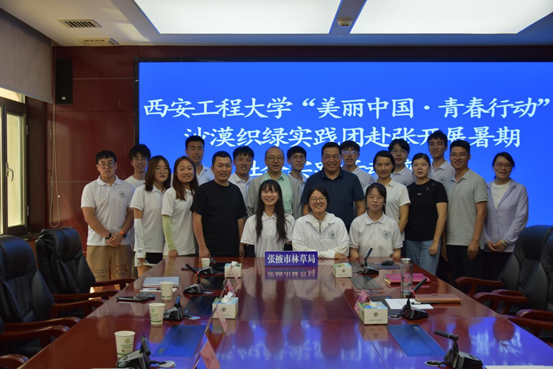 国之大者,生态卫士。在奥林匹克森林公园,甘州区林业和草原局谢小龙局长向我们介绍到,过去的几年里,张掖市大力支持沙漠治理,全面推进沙漠防沙固沙措施,同时对于荒芜土地进行换土工程,并且根据实地情况,选择栽培合适的树种进行绿化措施,未来,张掖市将继续坚持绿化和治沙措施,同时对绿化后的森林公园进行适当地旅游资源开发和宣传,让更多人了解绿化措施;在张掖市林业和草原局,张掖市林业和草原局副局长苗东对张掖市十余年来荒漠化治理情况和整体规划设计实施情况向实践团做了介绍,让全体实践团成员备受震撼和骄傲,为张掖市在美丽中国建设中付出的代价震撼,为他们取得的成绩骄傲,为生在这个伟大的祖国自豪。实践团副教授罗萌代表实践团向张掖市林业和草原局赠送“国之大者,生态卫士”锦旗,饱含了师生对张掖林业局和张掖人民以及所有生态卫士的崇高敬意。沙漠绿化、植树造林、储备林计划,“绿水青山就是金山银山”,他们话语的字里行间内无不透露着张掖人民对绿水的向往,无不彰显着张掖人民对青山的渴望。张掖人民在用实际行动去实现内心的呼声,在用现在的刻苦努力去创造未来的绿色家园。