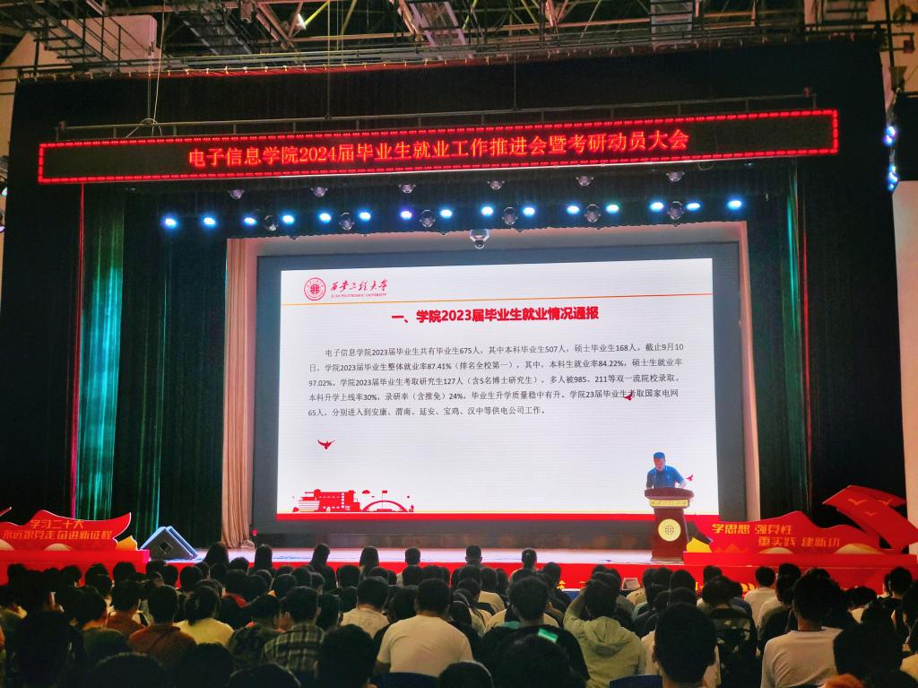 为深入贯彻落实中省有关做好2024届毕业生就业工作相关要求,根据学校就业工作安排,9月11日,电子信息学院在临潼校区大学生活动中心成功召开2024届毕业生就业工作推进会暨考研动员大会。学院党委副书记周晓惠、西安爱科赛博电气股份有限公司人资总监邵曼媛、西安图为电气技术有限公司人资总监马媛、西安图为电气技术有限公司供应链管理部总监史耀华、电子信息学院2023届校友、西安交通大学硕士研究生李敏洁、学院研究生辅导员周梦宇、本科毕业班辅导员王家钰以及600余名毕业生参加大会。会议由学院就业工作辅导员黄木委主持。