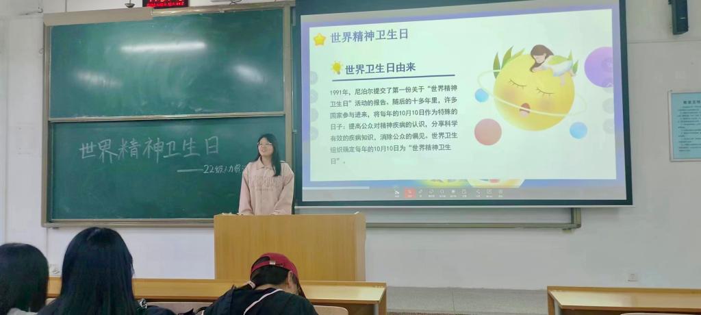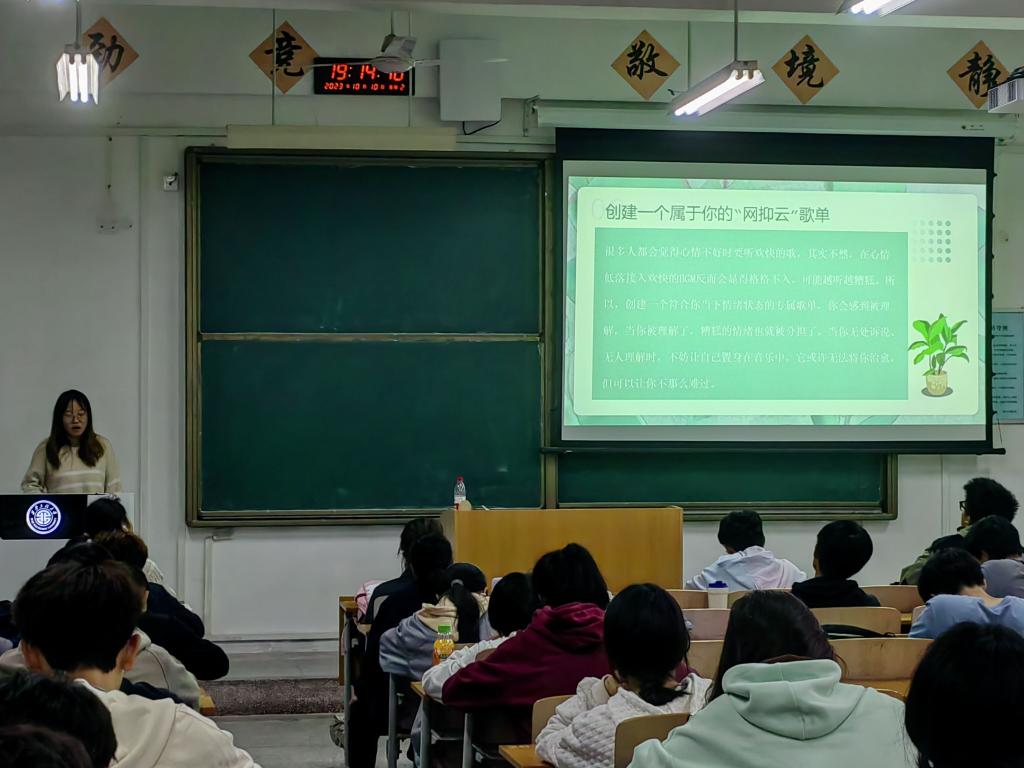 活动期间,学院还开展了新生适应性团体辅导,为本科和硕士新生上好“大学第一课”;学院二级心理辅导站学生团队在教学楼新生自习室为大一新生开展科普讲解,介绍世界精神卫生日的来由,普及大学生常见的心理问题及调节方法;学院组织各班级开展“世界精神卫生日”主题班会,进行心理健康教育普及宣传,累计举办班会24场,提高了同学们对精神卫生知识的认识和理解。