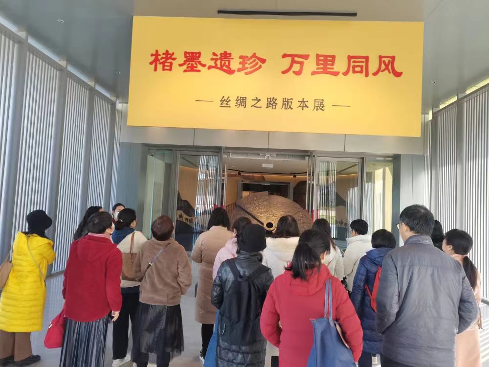 在讲解员的导引下,与会人员详细了解版本馆建设情况,依次参观学习了《赓续文脉踔厉前行——中华文化经典版本展(西部篇)》和《楮墨遗珍万里同风——丝绸之路版本展》两个经典展览。《赓续文脉踔厉前行——中华文化经典版本展(西部篇)》,以中华文化的经典版本为依托,立足西部,集中展出彰显民族根脉、延安精神、伟大复兴中国梦的中华文化经典版本。《楮墨遗珍万里同风——丝绸之路版本展》以丝绸之路文化为主题,以古丝绸之路文献版本为基础,以陕西典藏为依托,按照“凿空西域丝路贯通(两汉)”“通衢延绵殊方共享(魏晋南北朝)”“融汇通达盛世高峰(隋唐)”“中西交汇文脉绵长(宋元明清)”“谱写新篇筑梦大同(新时代)”五个部分进行布展。