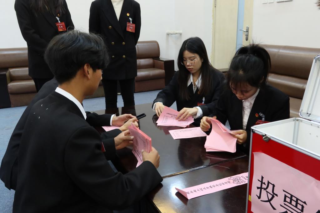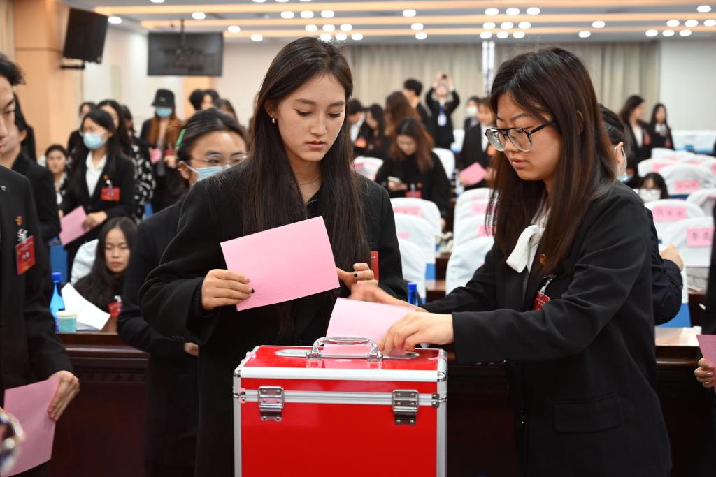大会第二阶段选举产生服装学院第一届团委会委员,现场100名代表按照规范的选举流程,公平、公正、公开地投票选举产生了7名委员。大会主席团成员、第一届团委会委员郭慧婷向服装学院全体团员青年发出倡议:一要不断修炼自我,弘扬爱国主义精神,做传播时代新风的有德青年;二要保持艰苦奋斗,主动担当作为,做建设祖国,推动社会发展的有为青年;三要坚持向人民学习,力求知行合一,做可堪重任的有才青年。