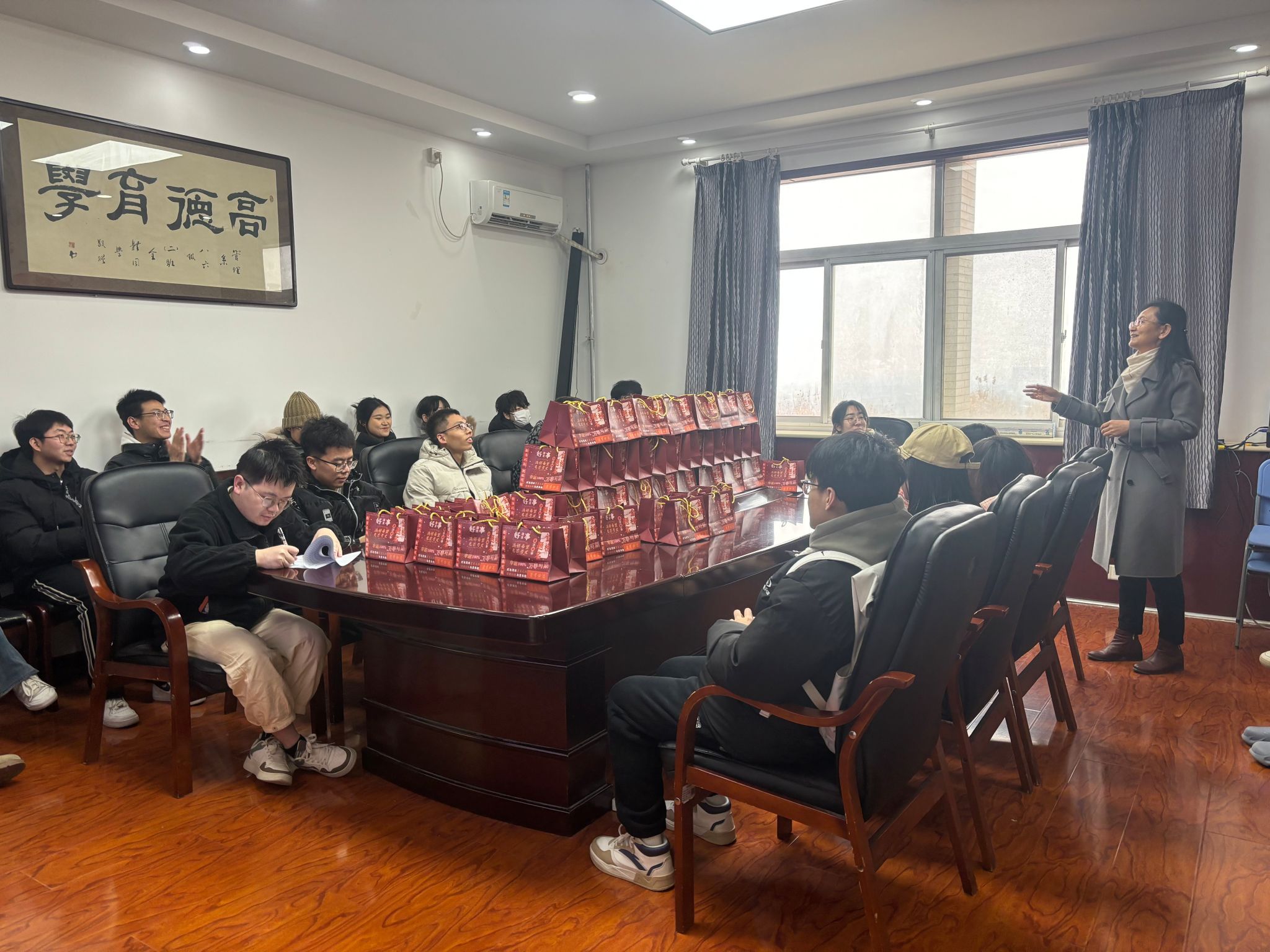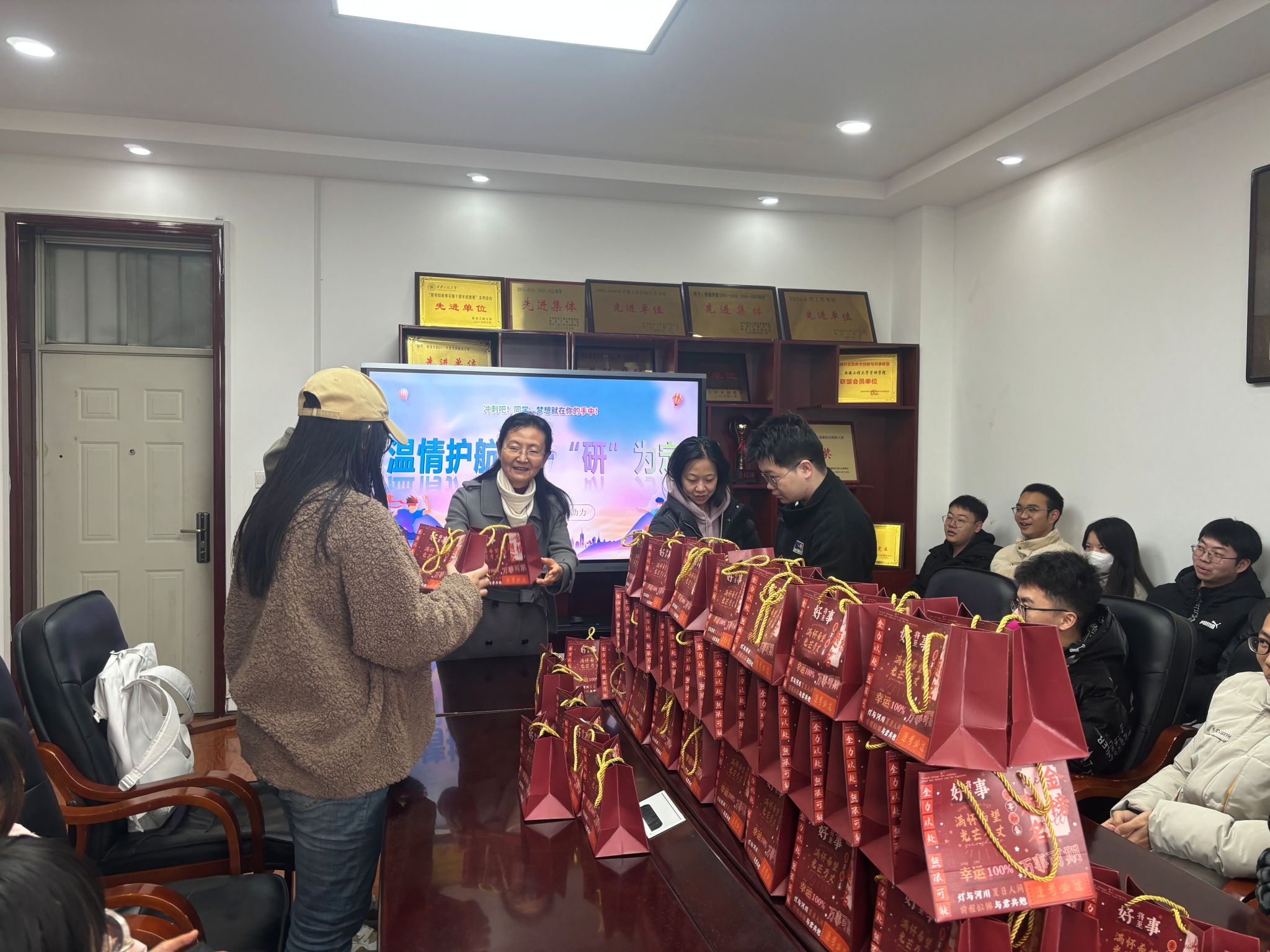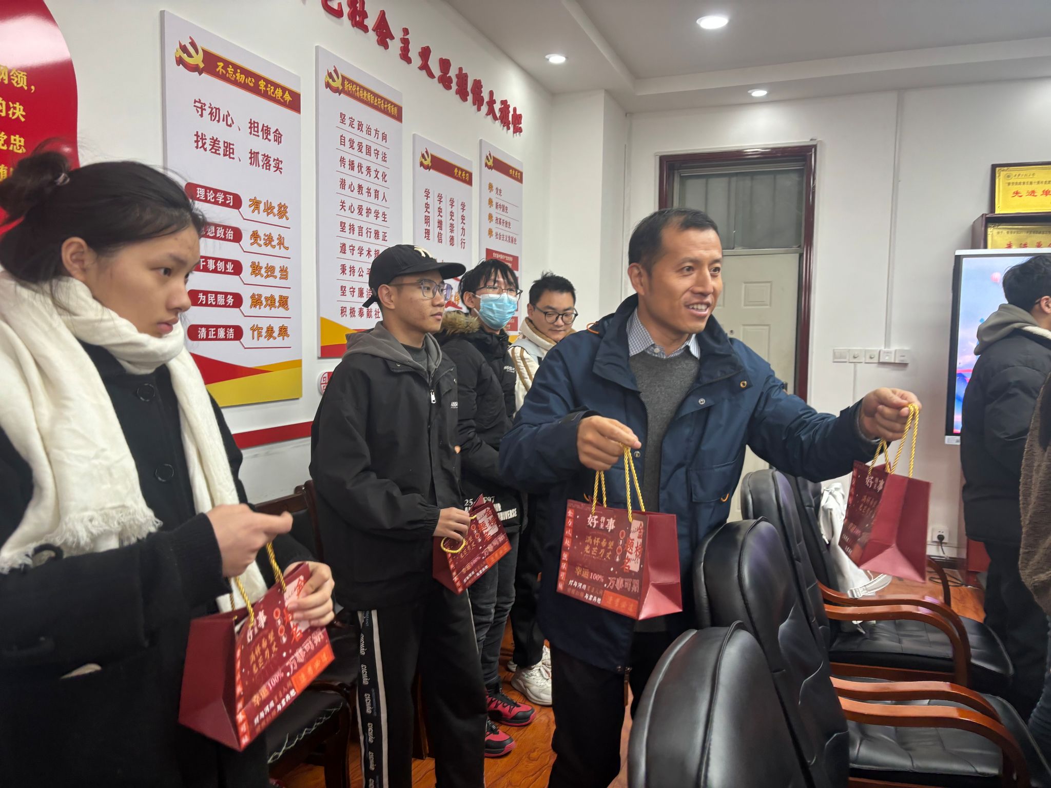 12月13日,学院党委书记王爱华、副书记代锴及全体辅导员看望并慰问考研学生。王爱华叮嘱同学们,近期气温骤升骤降,严重影响到每一位考生的备考安排,在临近考试的关键时刻,同学们一定要做好个人防护,保证身体健康状况不受影响。同时,也要坚定自信,放松心态,调整好作息,适应考试节奏。希望所有考生在接下来的一周时间能安排好复习进度,顺利完成各项考试任务,取得研究生考试的最后胜利。随后,老师们为学生送上学院定制的“金榜题名”礼包,将祝福送给所有备考学生。