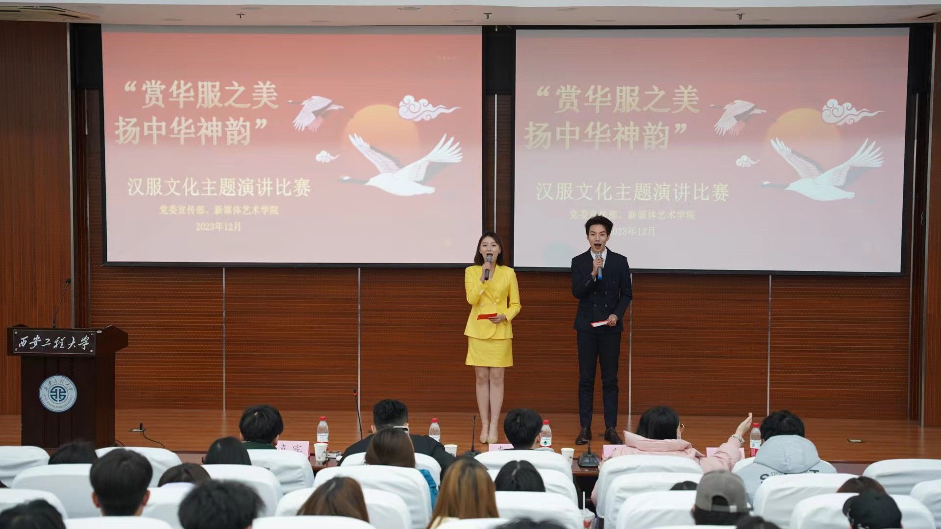 为了营造永利官网积极传承中华优秀传统文化的良好氛围,发挥“一站式”综合服务优势,宣传汉服文化;同时结合播音与主持艺术学生专业特色,发挥学生演讲、主持、朗诵等专业素养,进一步调动学生学习的积极性、主动性、创造性。在学校党委宣传部指导下,新媒体艺术学院于12月15日晚19:00在临潼校区图书馆二楼报告厅举办了“赏华服之美,扬中华神韵”汉服文化主题演讲比赛。纺织学院赵森、理学院宋琦、城市规划与市政工程学院杜倩、新媒体艺术学院宾田田老师和学生会主席团成员刘莘毓以及学生代表150余人出席本次活动。
