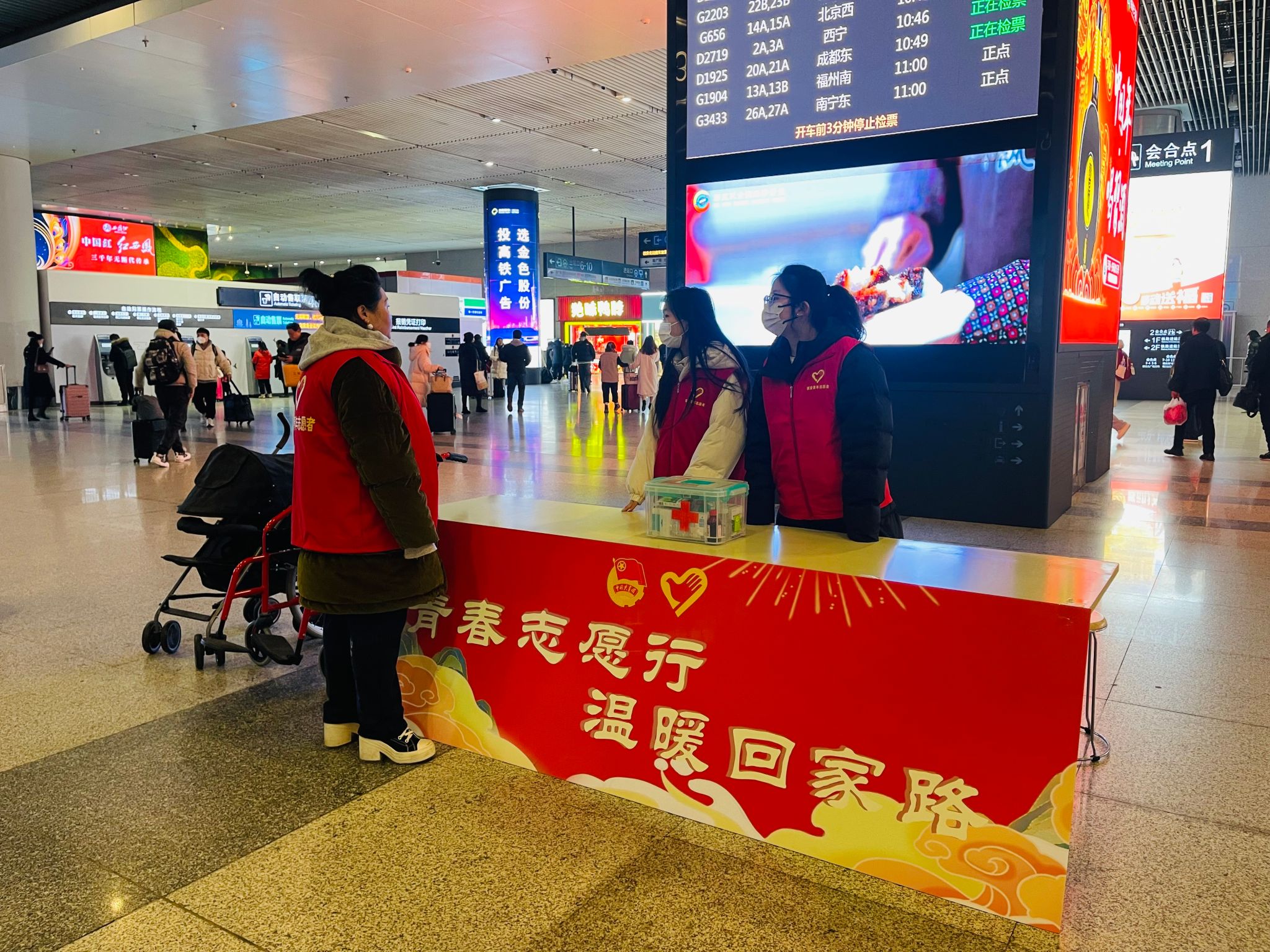 服装学院志愿者们遵从精准实施、规范管理、强化保障、注重宣传、做好嘉许五点工作要求,为旅客提供全方位的咨询服务。西安火车站在广场等区域设置咨询台,志愿者们耐心解答旅客对列车时刻、购票信息等方面的疑问,提供建议,帮助他们更好地进行行程安排。同时,志愿者们还在西安火车站广场协助公安执勤人员开展秩序维护工作,积极引导旅客有序排队,提供道路方向的帮助和指引,确保旅客能够安全、顺利地进出车站,防止拥堵情况的发生。此外,还有贴心的便民服务,志愿者们为旅客提供热水和急救药品等必要的物品。